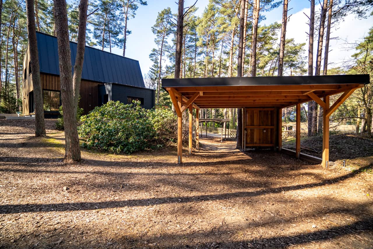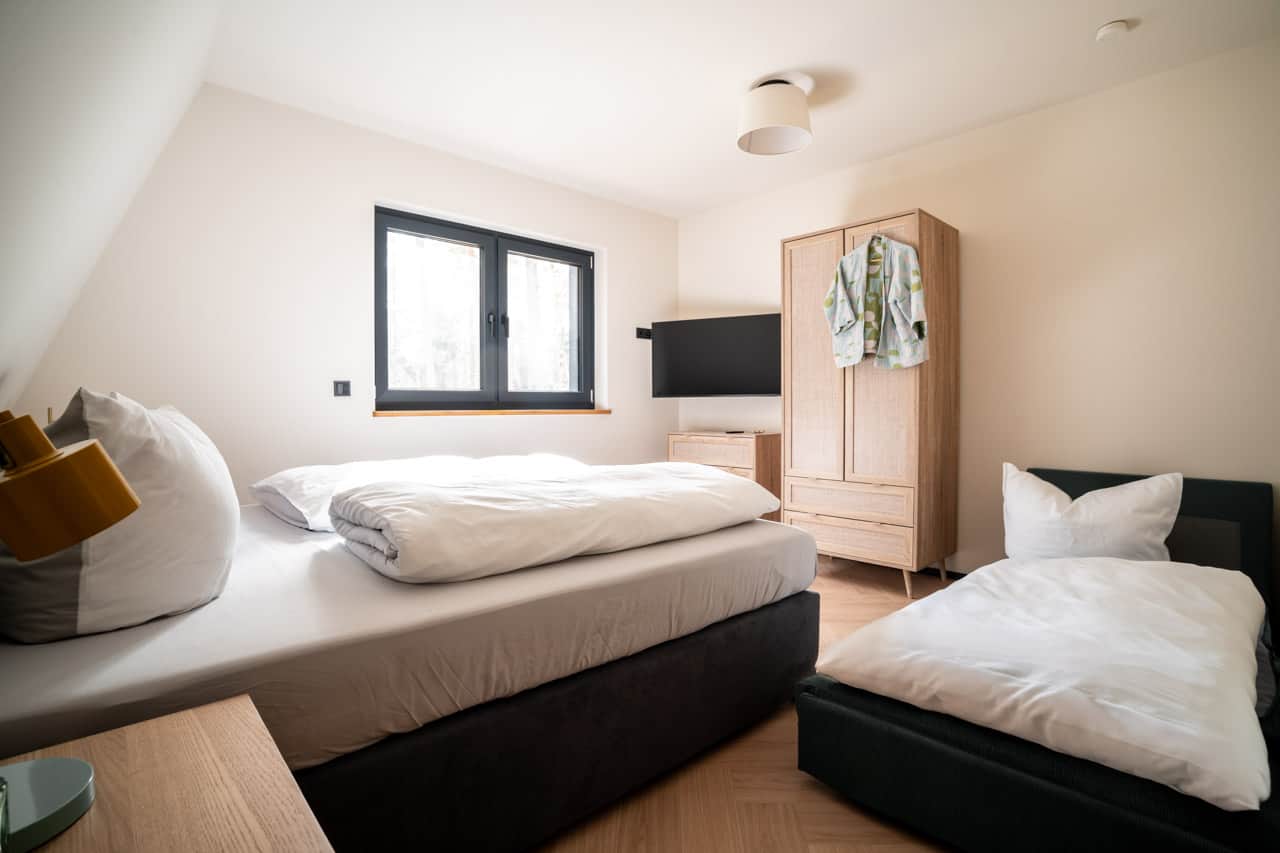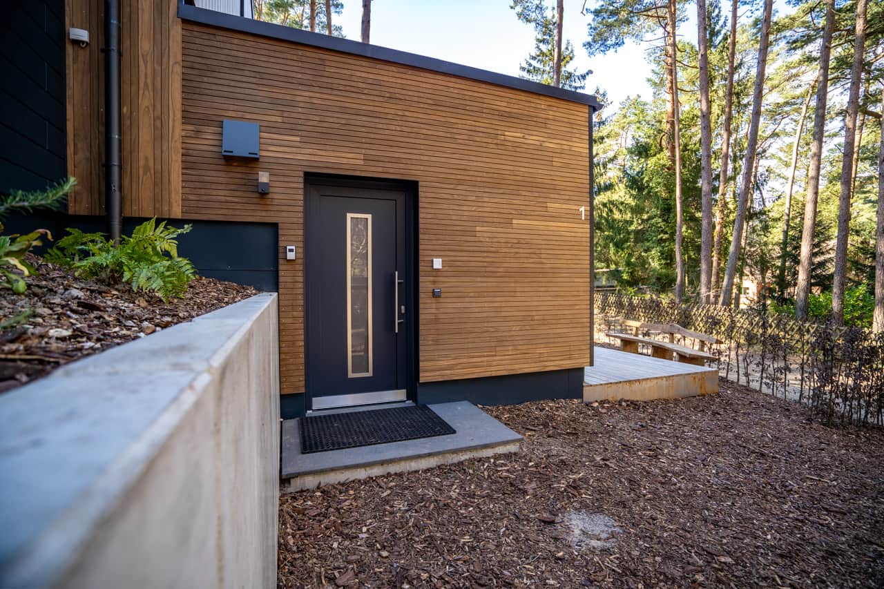 Besonderheit der Waldvilla ist das modulare Konzept des Ferienhauses. Es ist aus zwei optional interconnecting Einheiten entworfen, sodass dieser Ort wahlweise getrennt oder exklusiv genutzt werden kann. Die Unit "Franz" ist angelehnt an Tiny House Konzepte und bietet Platz für bis zu zwei Personen. Die Unit "Gustav" mit privatem Eingang verfügt über zwei Schlafzimmer jeweils mit en suite Badezimmer, und ein Kinderzimmer. Als besonderes Highlight bietet das Master-Schlafzimmer eine freistehende Badewanne mit Blick in den Kiefernwald. Die Unit "Gustav" eignet sich so für Gruppen bis zu sieben Personen. Exklusiv bietet die Waldvilla mit insgesamt drei privaten Schlafzimmern, einem Kinderzimmer, drei Bädern, einem Wellness-Bereich mit Sauna, Kamin und Leseecke, einer modernen Wohnküche für Hobbyköch*innen sowie zusätzlicher Wohnküche im Tiny House einen Wohlfühlort für Gruppen bis 9 Personen.