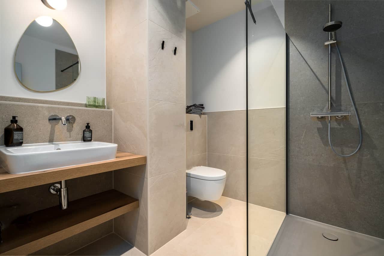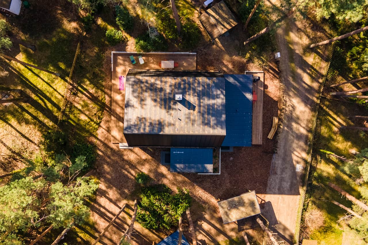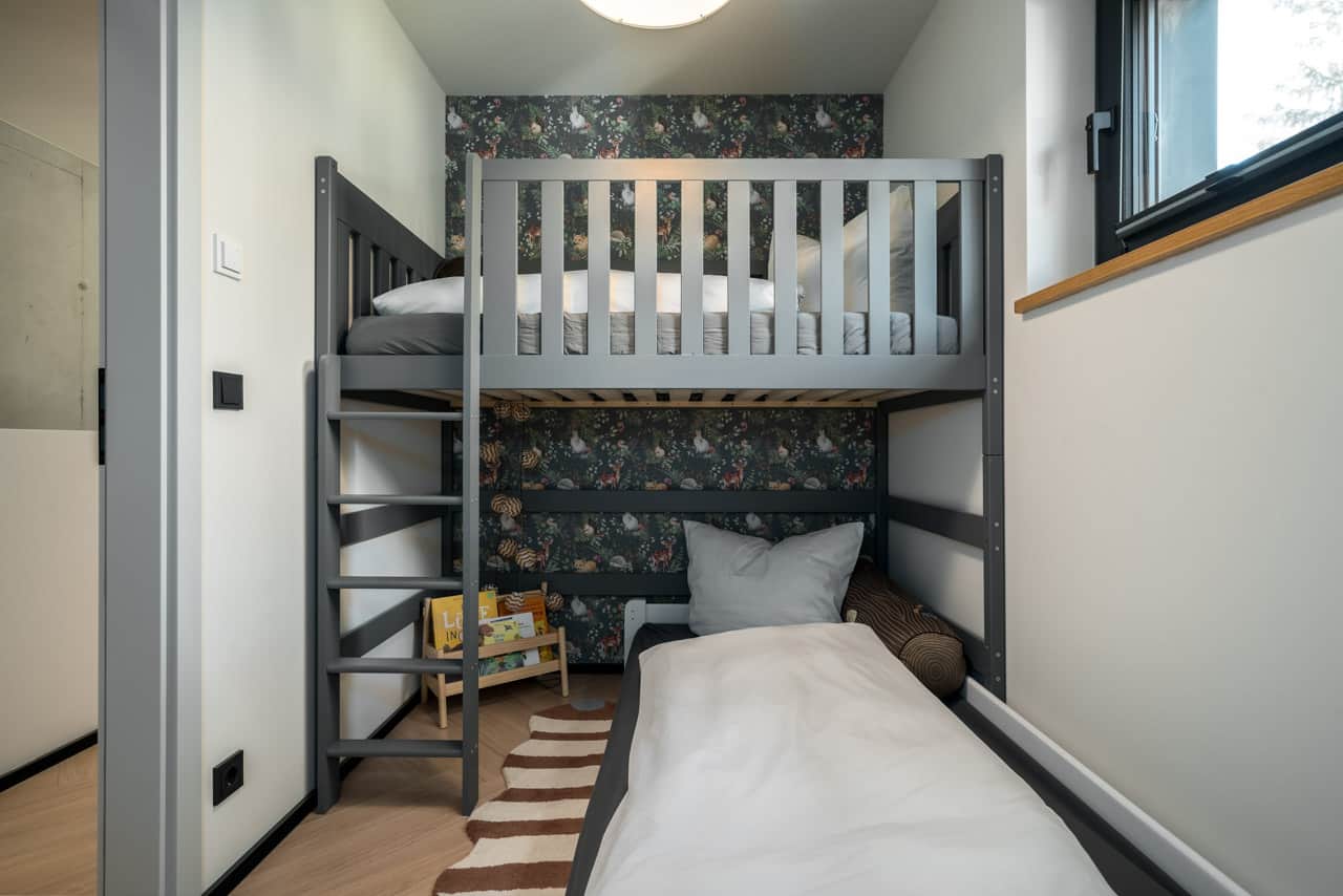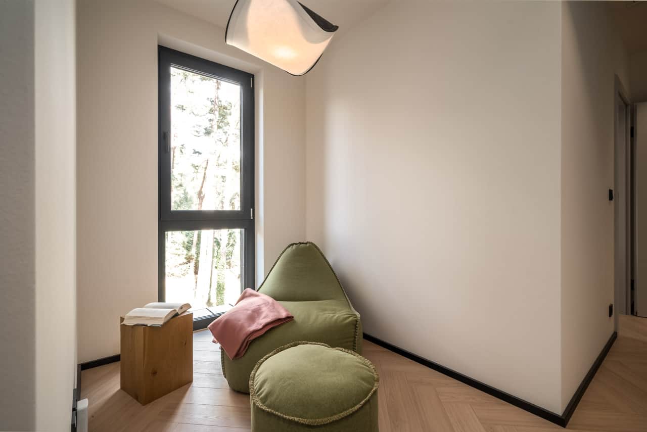 Besonderheit der Waldvilla ist das modulare Konzept des Ferienhauses. Es ist aus zwei optional interconnecting Einheiten entworfen, sodass dieser Ort wahlweise getrennt oder exklusiv genutzt werden kann. Die Unit "Franz" ist angelehnt an Tiny House Konzepte und bietet Platz für bis zu zwei Personen. Die Unit "Gustav" mit privatem Eingang verfügt über zwei Schlafzimmer jeweils mit en suite Badezimmer, und ein Kinderzimmer. Als besonderes Highlight bietet das Master-Schlafzimmer eine freistehende Badewanne mit Blick in den Kiefernwald. Die Unit "Gustav" eignet sich so für Gruppen bis zu sieben Personen. Exklusiv bietet die Waldvilla mit insgesamt drei privaten Schlafzimmern, einem Kinderzimmer, drei Bädern, einem Wellness-Bereich mit Sauna, Kamin und Leseecke, einer modernen Wohnküche für Hobbyköch*innen sowie zusätzlicher Wohnküche im Tiny House einen Wohlfühlort für Gruppen bis 9 Personen.